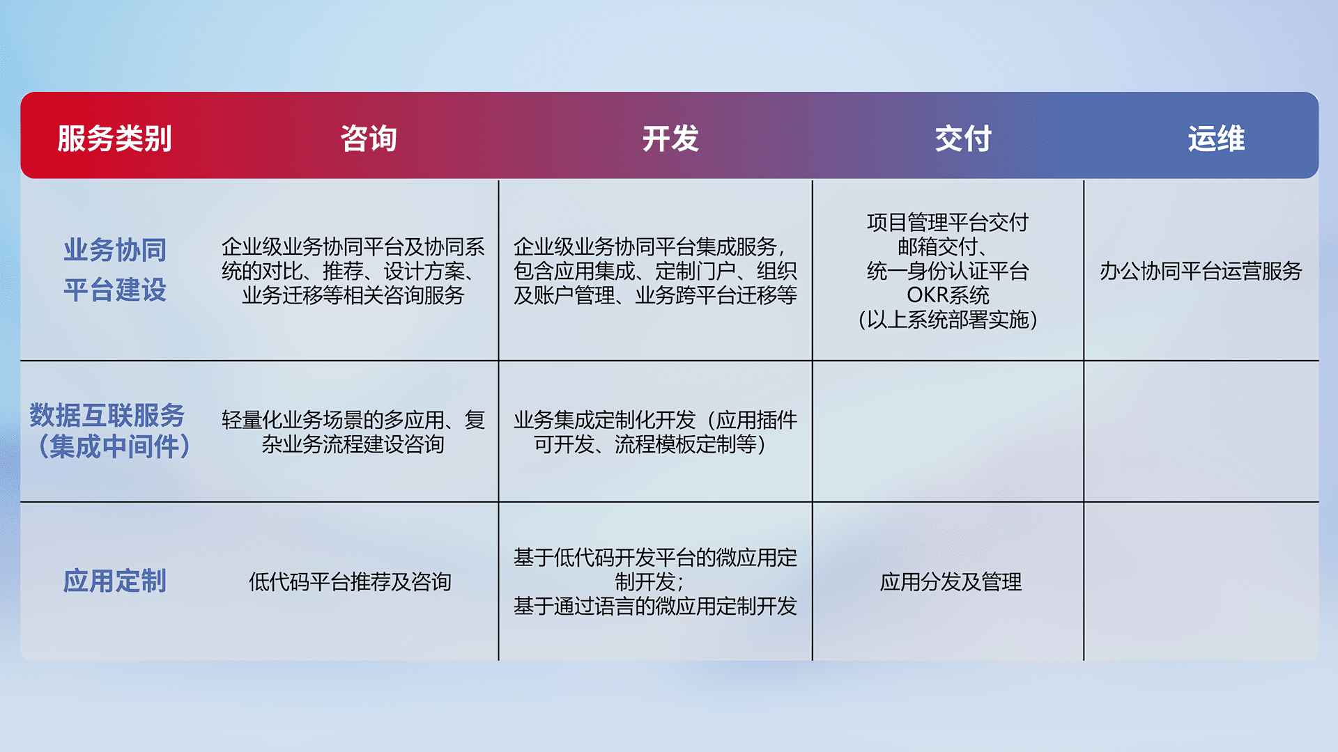 针对钉钉、、、企微、、、IDaas等平台级产品提供产品的规划、、、方案、、交付、、、、定制化开发等服务,,实现如统一协同办公、、智能客户服务、、、混合会议管理、、、智能数据查询、、、等业务场景,,,,实现数字化转型。。